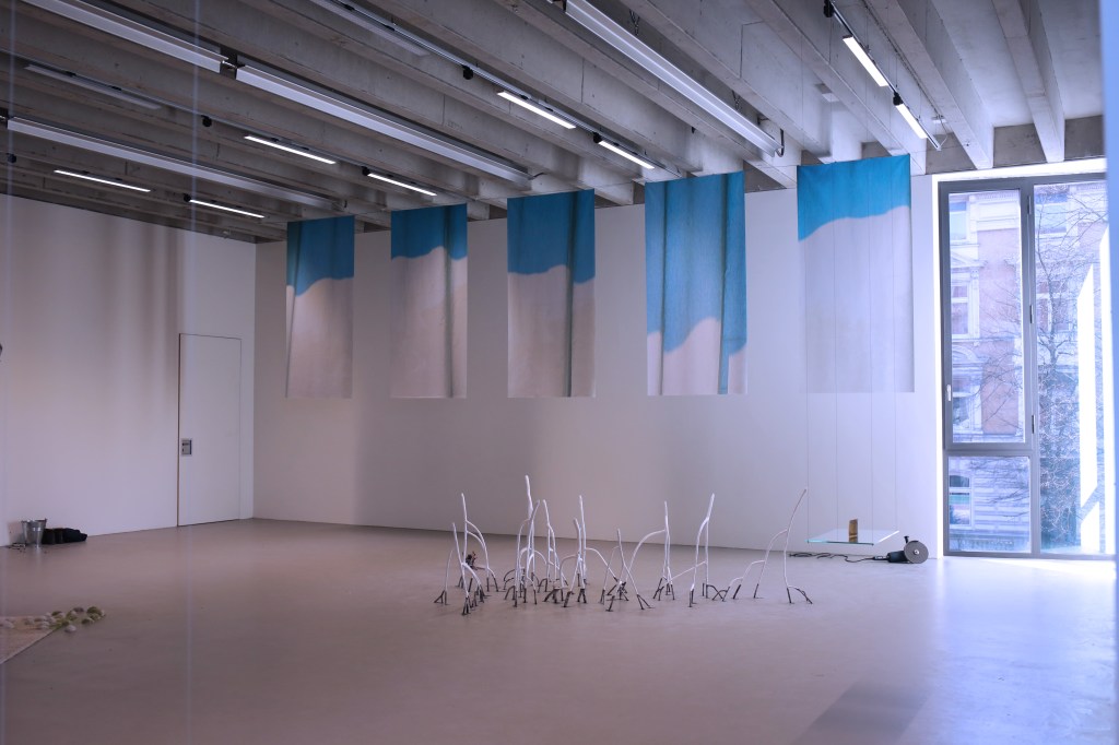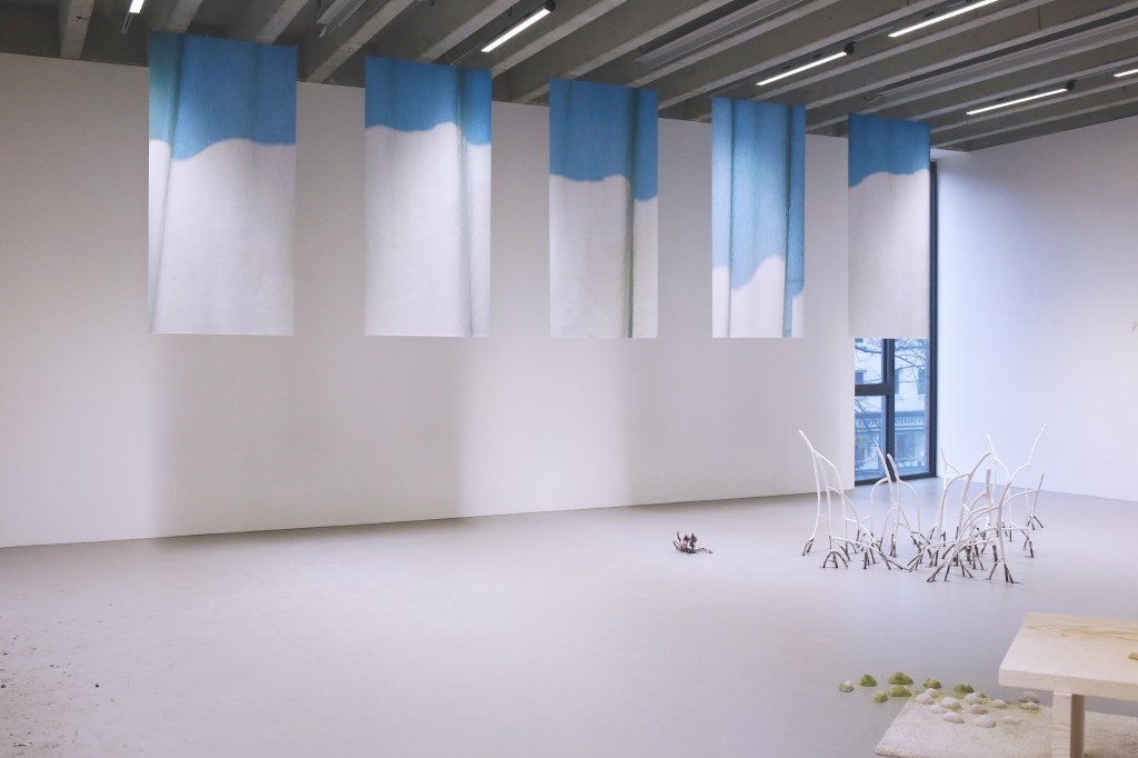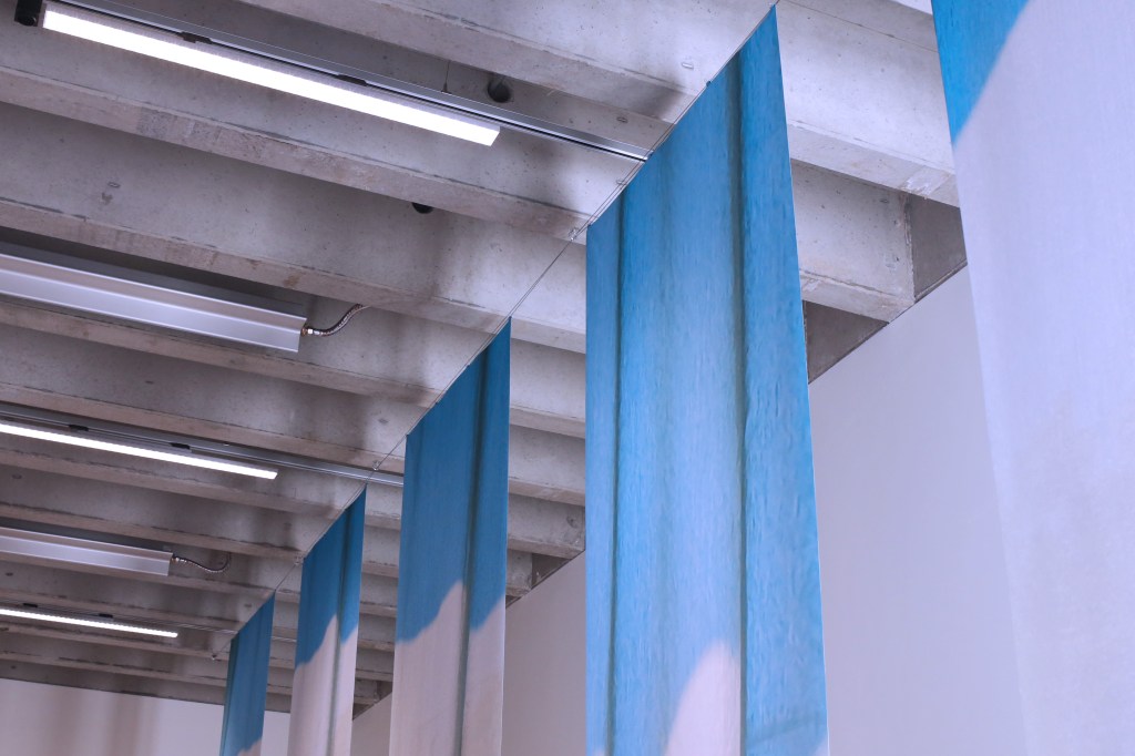 The sun shines on a weaved curtain that covers the window, creating a reflection on the curtain. The reflection divides the curtain into two distinct parts – a white part and a blue part. The curtain is then flattened and compressed into polyester through the printing process. The resulting cutout curtain in a shape of the smartphone screen becomes a monument the exhibition space.